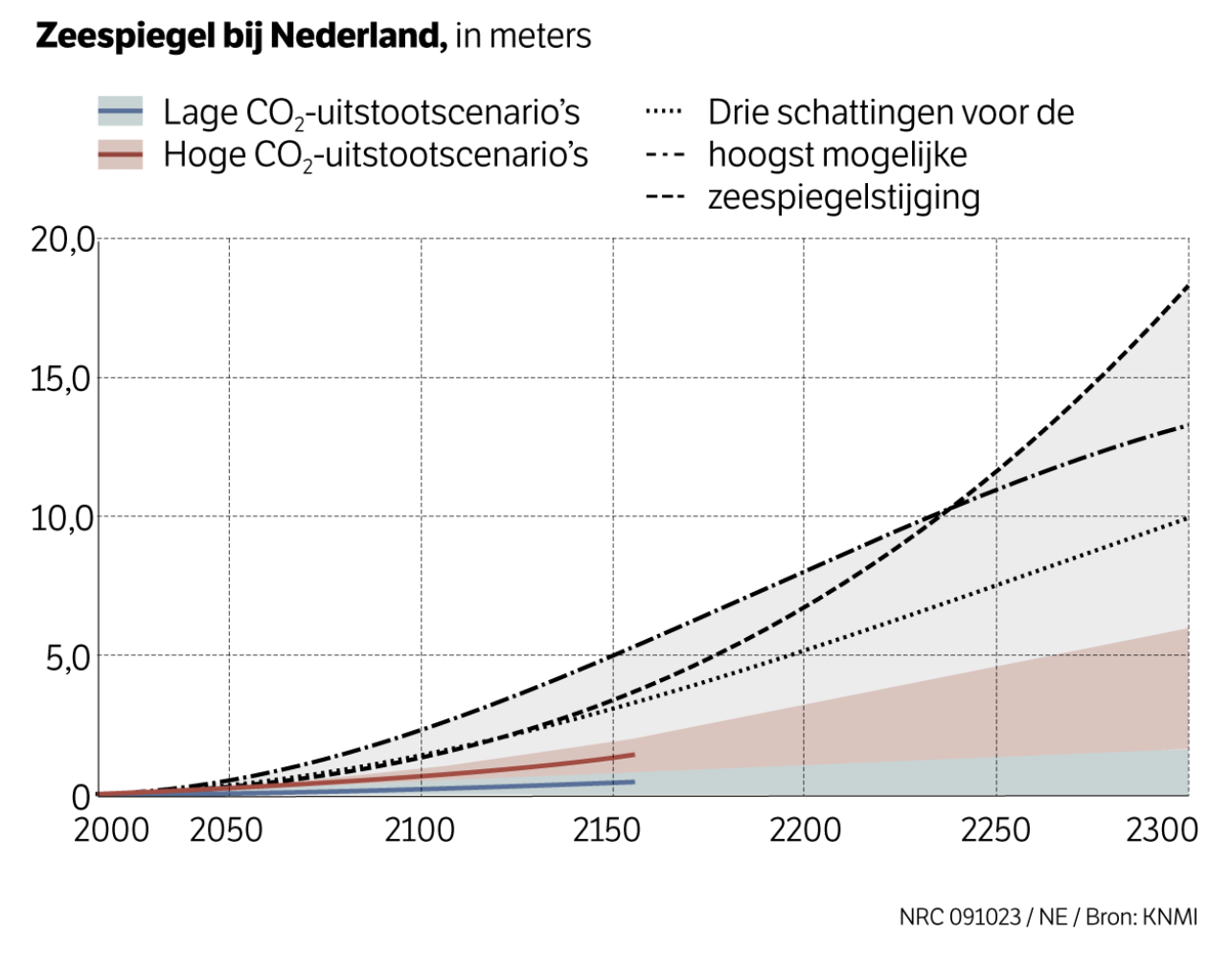 Volgens de hoge CO2-uitstootscenario’s zal de zeespiegelstijging voor Nederland rond het jaar 2300 op 2 tot 6 meter uitkomen. Als ook onzekere ijskap-processen op Antarctica worden meegenomen, kan dit in het ergste geval oplopen tot meer dan 17 meter…