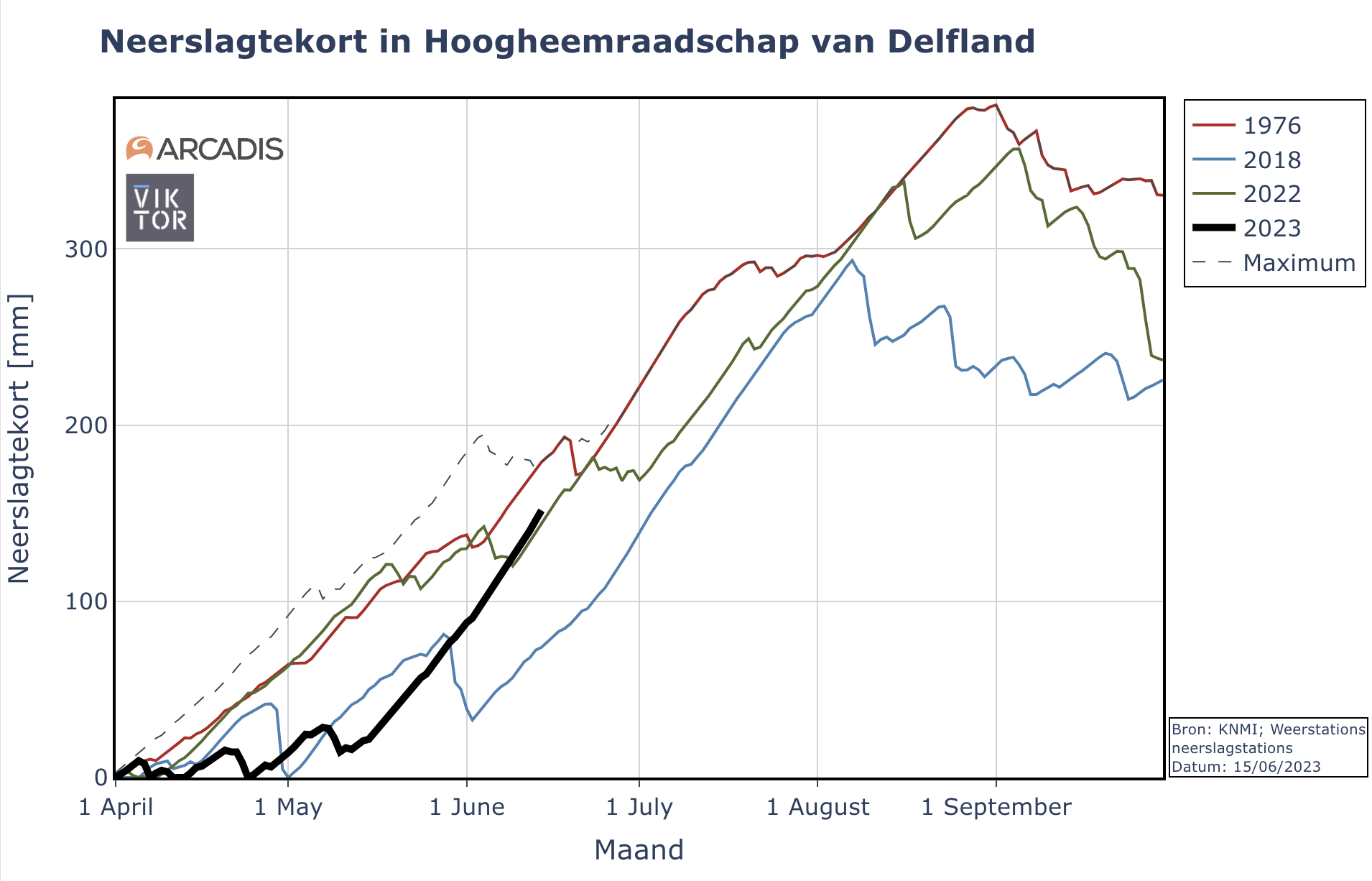 Op dit moment gaat Delfland aan kop met een neerslagtekort van 150 mm (peildatum: 15 juni 2023). Het neerslagtekort is nu al even hoog als in 2022 en hoger dan in 2018 op dezelfde datum. In de noordelijke waterschappen is het neerslagtekort het laagst.