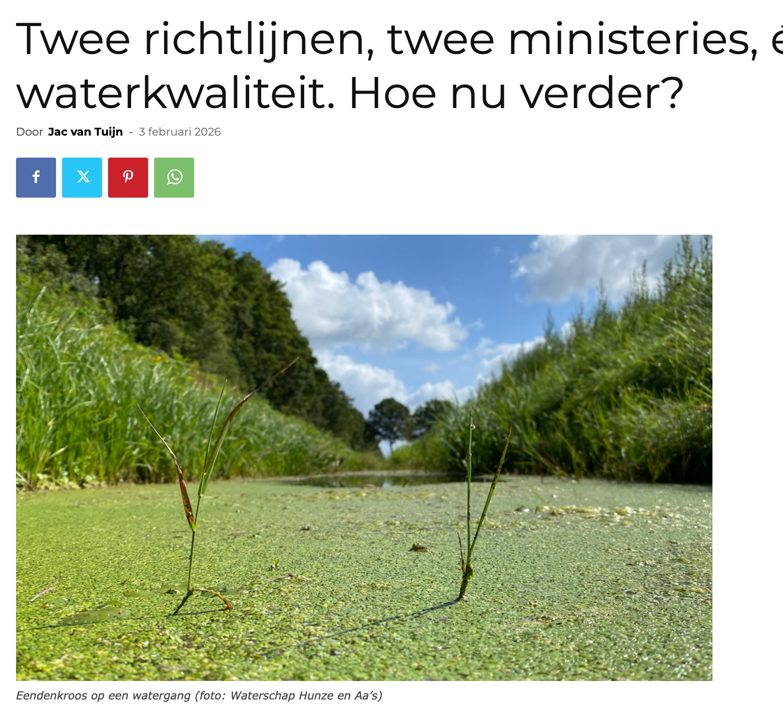 Het lukt de Nederlandse overheid maar niet om de uitvoering van de Nitraatrichtlijn en de Kaderrichtlijn Water (KRW) op één lijn te krijgen. Vorige week werd het advies van de Landsadvocaat over het ontwerp van het 8e Actieprogramma Nitraatrichtlijn alsnog openbaar gemaakt. Het advies van november vorig jaar blijft normaal gesproken vertrouwelijk, maar in dit geval is een uitzondering gemaakt vanwege de hoog opgelopen ruzie tussen het ministerie van Landbouw en het ministerie van Infrastructuur en Waterstaat (IenW) over het mestbeleid en de waterkwaliteit.