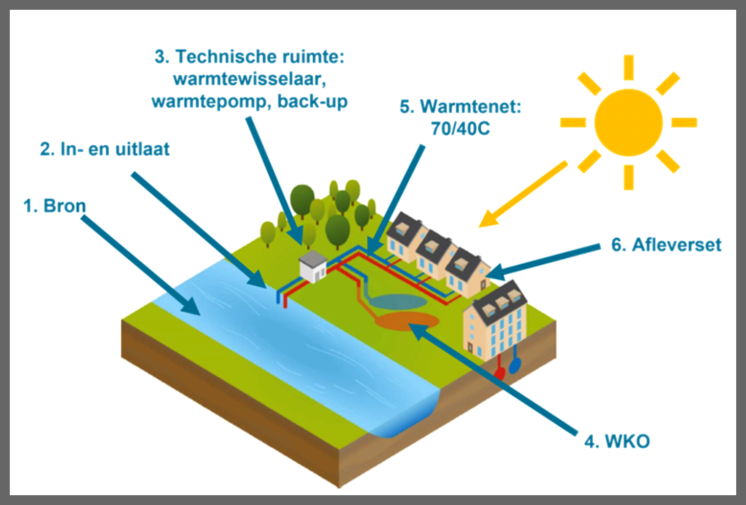 Delfland, 18 juni 2025. Aquathermie is een innovatieve en duurzame techniek om warmte uit oppervlaktewater te winnen voor de verwarming van woningen. Water uit een kanaal bevat warmte, zelfs in de winter. Met behulp van een warmtewisselaar wordt deze warmte onttrokken. Vervolgens verhoogt een warmtepomp de temperatuur tot een niveau dat geschikt is voor het verwarmen van huizen of warm tapwater.