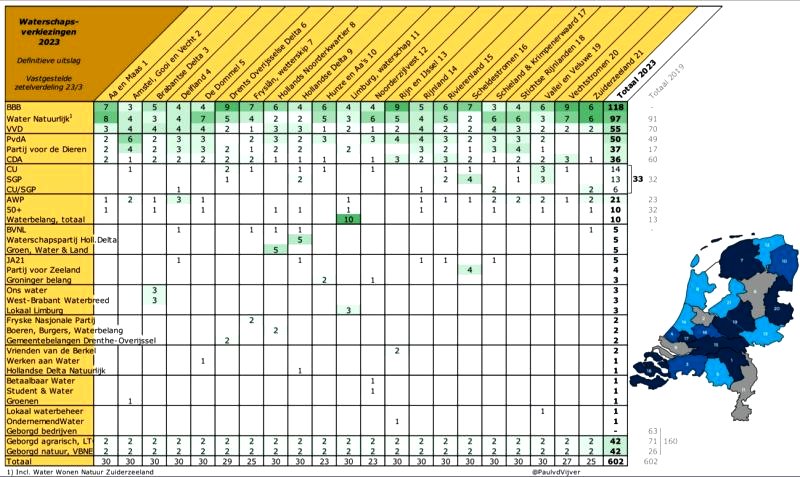In alle waterschappen samen zijn we gedaald van 23 naar 21 zetels. AWP Delfland is de grootste fractie met drie zetels (11% van de stemmen). En er zijn vijf waterschappen waar de AWP nu met twee zetels is vertegenwoordigd.