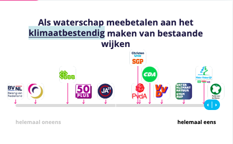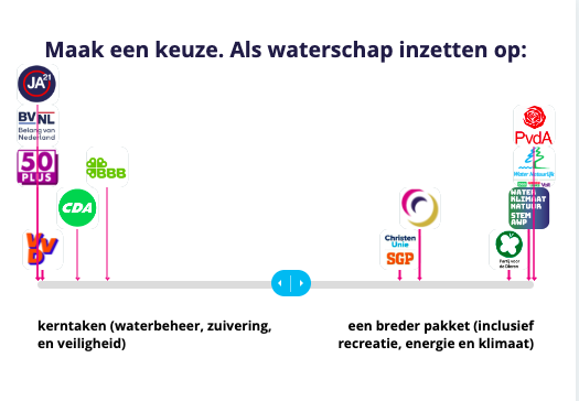 Volgens kieswijzer ‘MijnStem’, staat de AWP op de meeste stellingen dicht bij de partijen PvdA, PvdD en Water Natuurlijk, dat weer een samenwerkingspartij is van GL, D66 en Volt. Op specifieke onderwerpen kan de AWP goed samenwerken met de VVD. Maar partijen zoals BBB en JA21 staan ver van de AWP af.