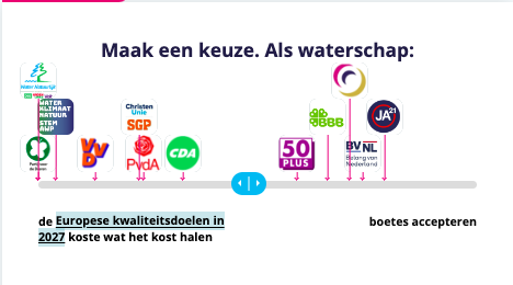 AWP vindt dat de EU-doelen voor een goede waterkwaliteit in 2027 moeten worden gehaald, ook als dat extra geld kost. Schoon en gezond water is in ons eigen belang, en essentieel voor de natuur. Bovendien hangen Nederland boetes vanuit de EU boven het hoofd als we de zelfggekozen doelen niet halen. Een vorige minister heeft al gezegd die boetes door te schuiven naar de waterschappen. AWP kan samenwerken met: WN, PvdD, VVD, PvdA en CU/SGP