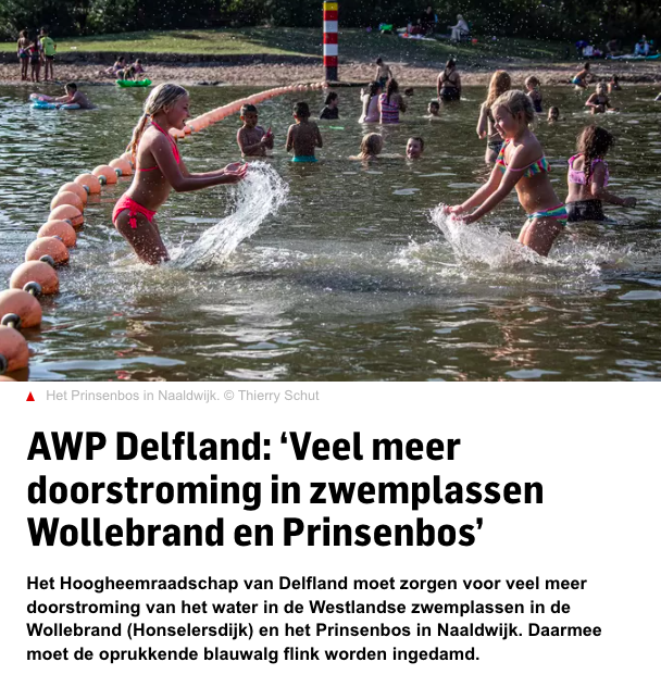 We willen kunnen zwemmen in bijvoorbeeld de Krabbeplas, de Delftse Hout en de Wollebrand., Vaak kan dit niet door blauwalg. AWP komt daarom regelmatig met oplossingen, zoals meer doorstroming. Het waterschap gaat in de komende periode per plas kijken waar de vervuiling vandaan komt en welke maatregelen genomen kunnen worden.