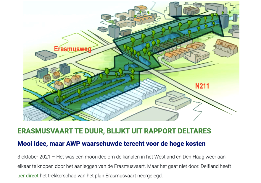 De Erasmusvaart tussen Westland en Den Haag was een mooi plan om ruimte te bieden voor water, natuur, rust en recreatie. AWP heeft er vanaf het begin op gehamerd dat we waar voor ons geld moesten krijgen. Uit de omgeving kregen we geluiden dat de doorvaarhoogte veel te laag zou blijven en er weinig ruimte zou overblijven voor water en natuur. De kosten werden steeds hoger. Het college heeft uiteindelijk nut en noodzaak laten onderzoeken. Hieruit bleek dat de zorgen van de AWP terecht waren.