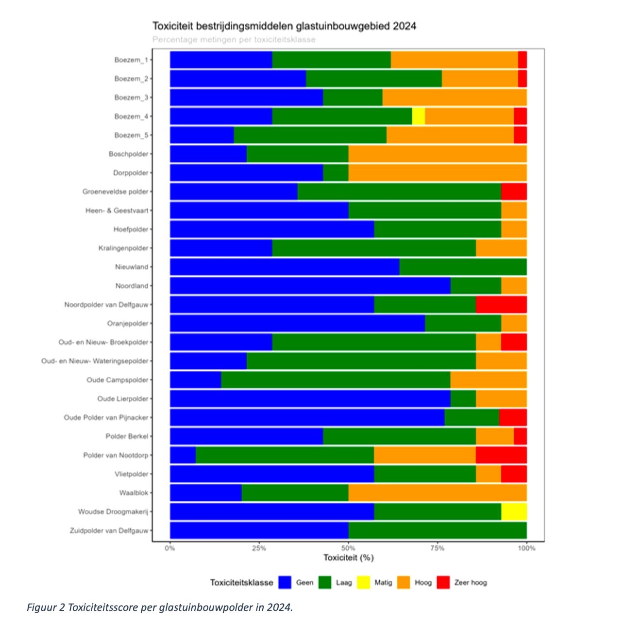In de Voortgangsrapportage Waterkwaliteit is de toxische druk in het boezemkanaal (op 5 locaties) en in de glaspolders onder elkaar gezet (als percentage van 12 metingen). Doel is dat het boezemwater en het polderwater het hele jaar schoon of bijna schoon zijn (klasse: blauw en groen).