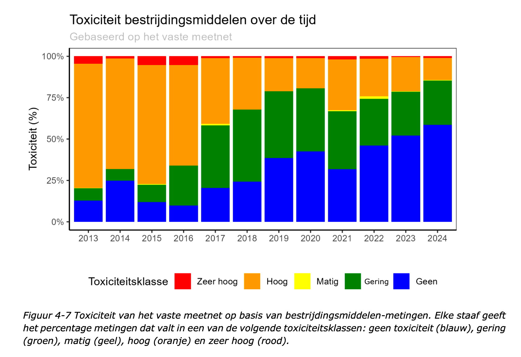 Toch is er verwarring over de informatie die Delfland toont. Kijk eens naar onderstaande grafiek, waar alle data per jaar op één hoop zijn gegooid. Duidelijk is dat de toxische druk tussen 2013 en 2024 is afgenomen: van meer dan 75% (oranje + rood samen) naar iets minder dan 25%. Dat is toch goed nieuws?