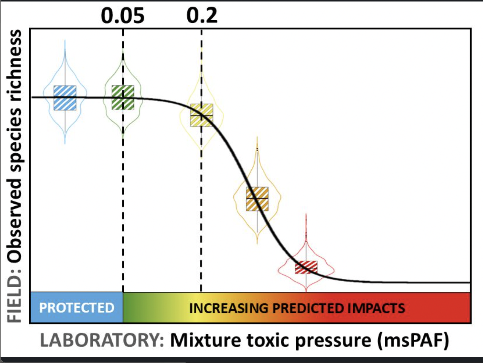 Schematisch ziet de relatie tussen toxische druk en biodiversiteit er zo uit: van weinig effect bij een blauwe of groene score, via geel naar heel veel effect bij een oranje of een rode score.