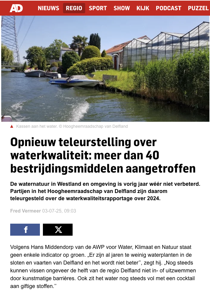 Ook zit het water nog steeds vol met een cocktail aan giftige stoffen. Zo zijn er in 2024 meer dan 40 bestrijdings-middelen aangetroffen in de glastuinbouwgebieden in gemeente Westland, Pijnacker-Nootdorp en in Lansingerland. Van de 26 polders met glastuinbouw waren er slechts 2 polders waar in 2024 geen enkele overschrijding van de veiligheidsnorm is gemeten (7%). In de meeste polders is er elk kwartaal wel een overschrijding. En dan zijn er natuurlijk nog de incidenten die niet worden ontdekt, omdat er slechts een keer per maand op slechts een punt in de polder wordt gemeten.