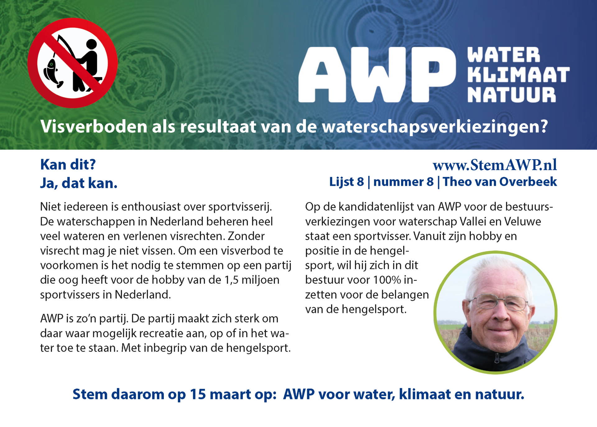 Vanuit mijn hobby en positie in de hengelsport wil ik ook in het waterschapsbestuur bijdragen aan een gezonde waterkwaliteit, verantwoord visstandbeheer en recreatief gebruik van water voor de hengelsport.