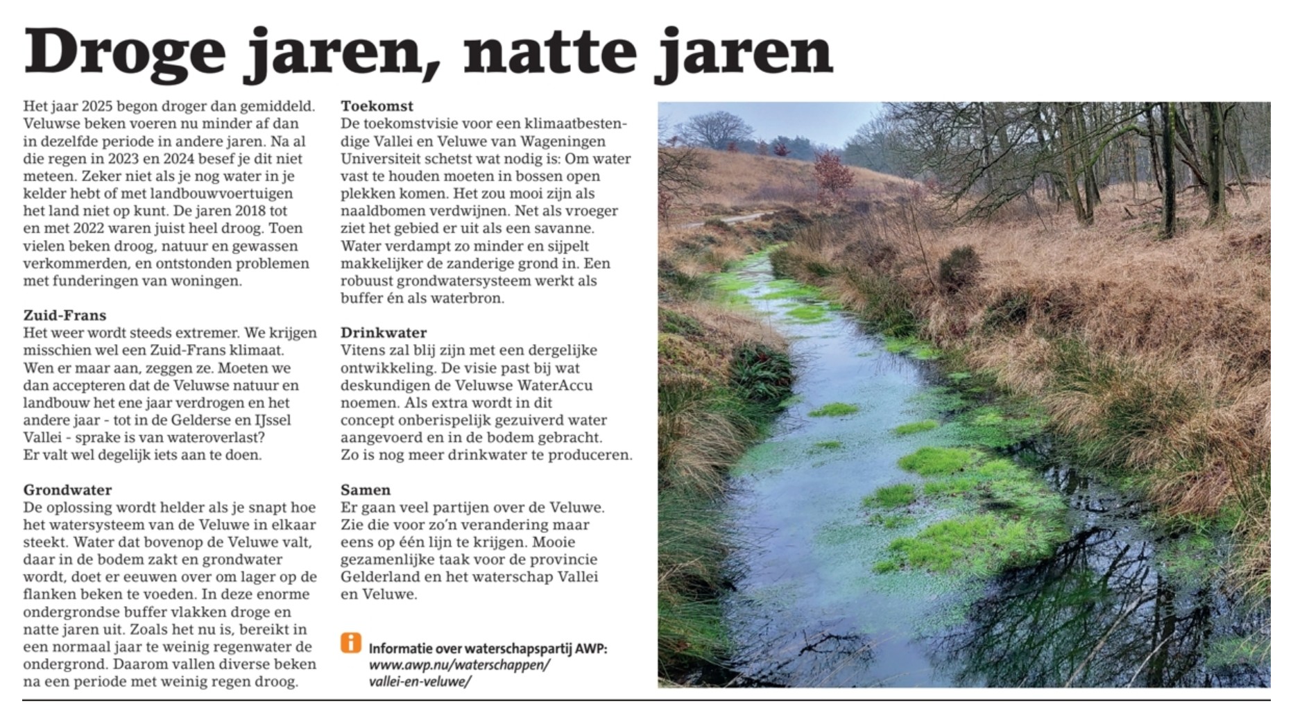 – 26 februari 2025 – Het jaar 2025 begon droger dan gemiddeld. Veluwse beken voeren nu minder af dan in dezelfde periode in andere jaren. Na al die regen in 2023 en 2024 besef je dit niet meteen. Zeker niet als je nog water in je kelder hebt of met landbouwvoertuigen het land niet op kunt. De jaren 2018 tot en met 2022 waren juist heel droog. Toen vielen beken droog, natuur en gewassen verkommerden, en ontstonden problemen met funderingen van woningen.