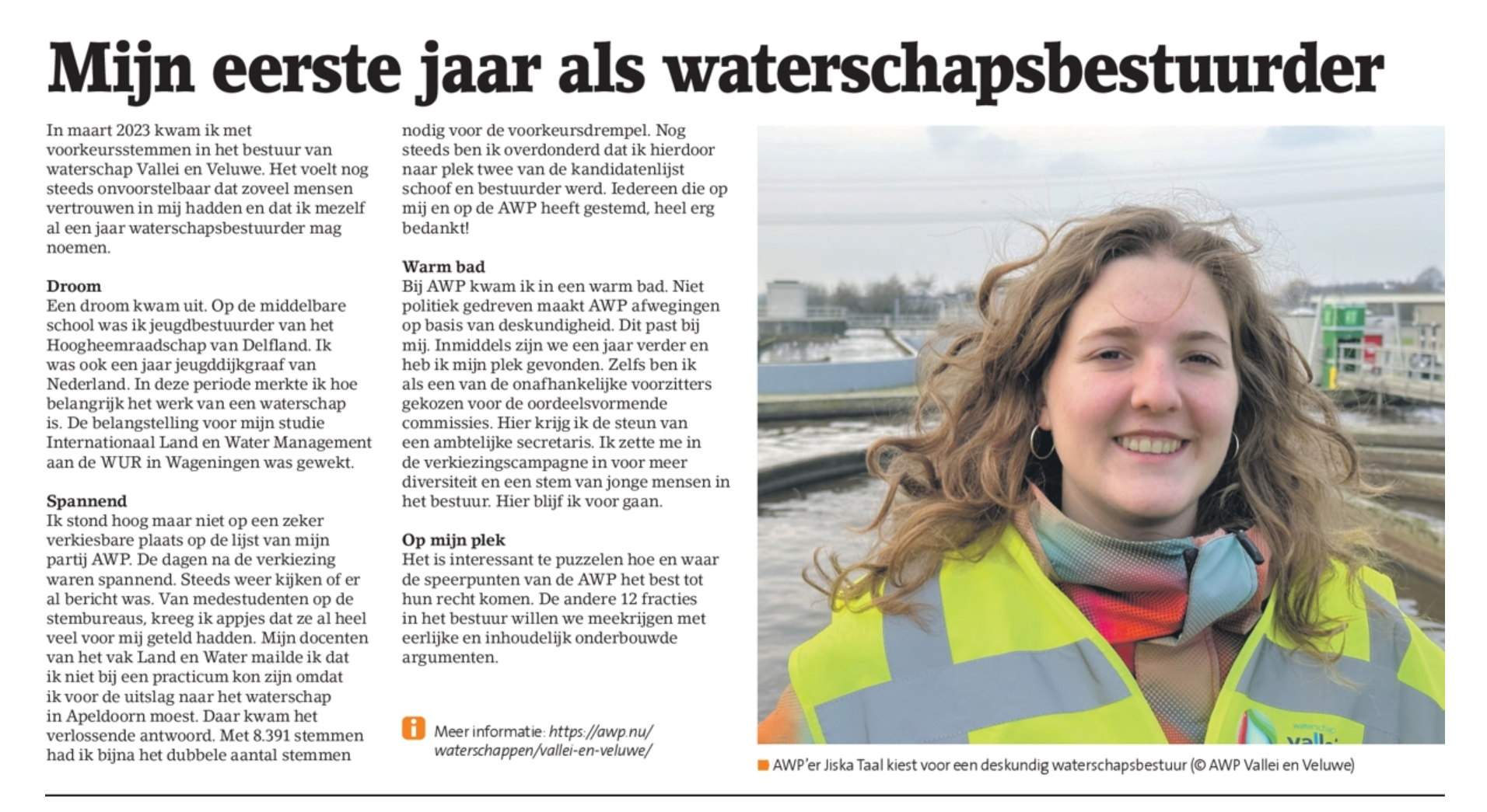 Ik stond hoog maar niet op een zeker verkiesbare plaats op de lijst van mijn partij AWP. De dagen na de verkiezing waren spannend. Steeds weer kijken of er al bericht was. Van medestudenten op de stembureaus, kreeg ik appjes dat ze al heel veel voor mij geteld hadden. Mijn docenten van het vak Land en Water mailde ik dat ik niet bij een practicum kon zijn omdat ik voor de uitslag naar het waterschap in Apeldoorn moest. Daar kwam het verlossende antwoord. Met 8.391 stemmen had ik bijna het dubbele aantal stemmen nodig voor de voorkeursdrempel. Nog steeds ben ik overdonderd dat ik hierdoor naar plek twee van de kandidatenlijst schoof en bestuurder werd. Iedereen die op mij en op de AWP heeft gestemd, heel erg bedankt!