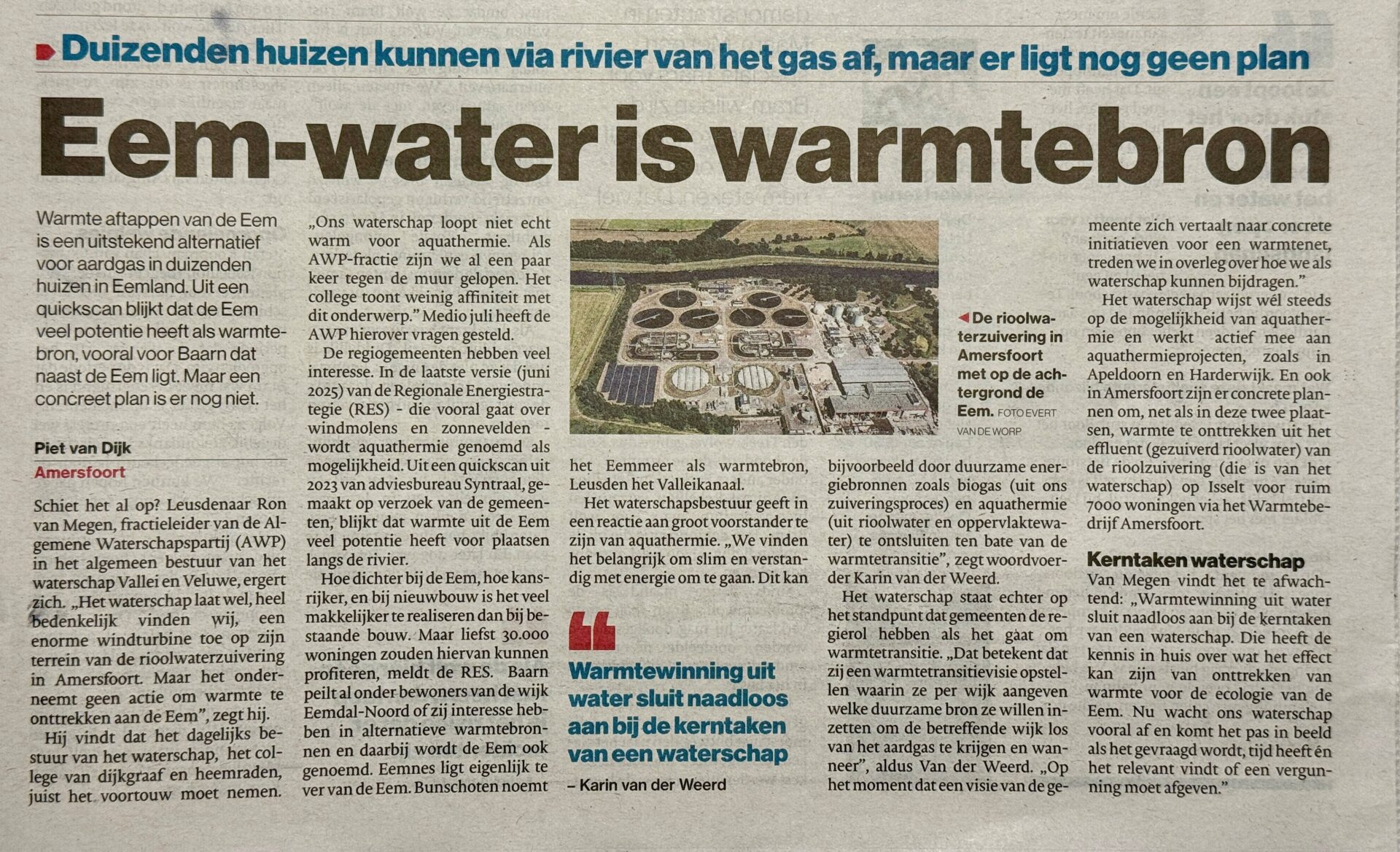 – 7 augustus 2025 – Waterschappen zijn als overheid partner in de Regionale Energie Stratgieën en kunnen een substantiële bijdrage leveren in de energietransitie. AWP ijvert al jaren voor een meer proactieve houding van waterschap Vallei en Veluwe in dit dossier. Met name de winning van warmte van water heeft veel potentie, veel meer dan zonne- en windenergie. Om het onderwerp levend te houden stelde AWP maar weer eens bestuurlijke vragen. Onderaan dit webartikel is een artikel uit de Amersfoortse Courant d.d. 18 augustus 2025 geplaatst (editie van het AD) over de mogelijkheden van warmtewinning uit de Eem t.b.v. gemeenten in de omgeving van Amersfoort.