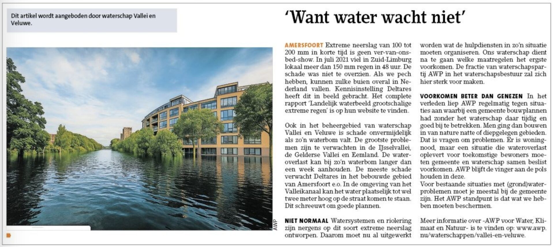 Watersystemen en riolering zijn nergens op dit soort extreme neerslag ontworpen. Daarom moet nu al uitgewerkt worden wat de hulpdiensten in zo’n situatie moeten organiseren. Ons waterschap dient na te gaan welke maatregelen het ergste voorkomen. De fractie van waterschapspartij AWP in het waterschapsbestuur zal zich hier sterk voor maken.