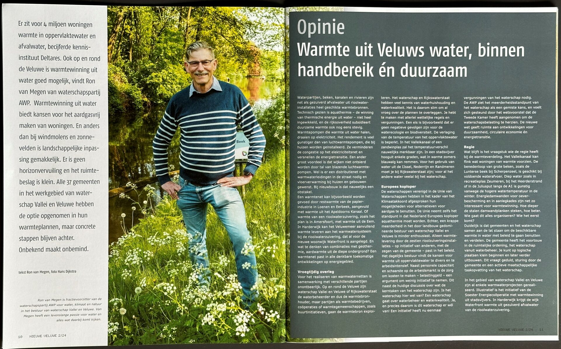 – 21 juni 2024 – Er zit voor 4 miljoen woningen warmte in oppervlaktewater en afvalwater, becijferde kennisinstituut Deltares. Ook op en rond de Veluwe is warmtewinning uit water goed mogelijk, vindt Ron van Megen van waterschapspartij AWP. Warmtewinning uit water biedt kansen voor het aardgasvrij maken van woningen. En anders dan bij windmolens en zonnevelden is landschappelijke inpassing gemakkelijk. Er is geen horizonvervuiling en het ruimtebeslag is klein. Alle 37 gemeenten in het werkgebied van waterschap Vallei en Veluwe hebben de optie opgenomen in hun warmteplannen, maar concrete stappen blijven achter. Onbekend maakt onbemind.