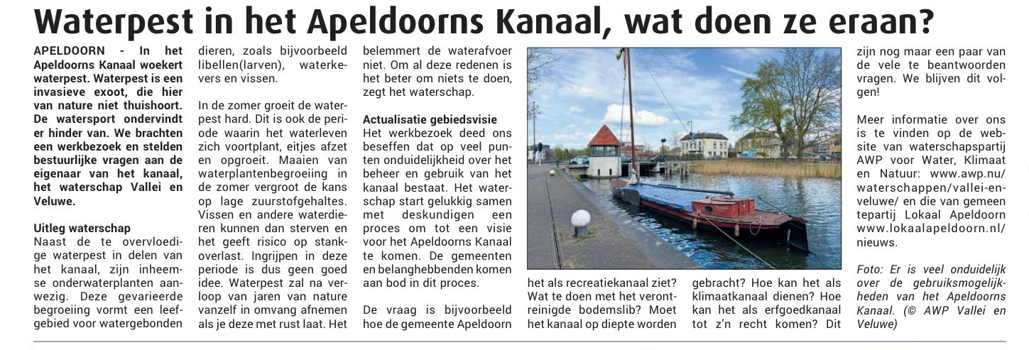 – 2 juli 2025 – In het Apeldoorns Kanaal woekert waterpest. Waterpest is een invasieve exoot, welke hier van nature niet thuis hoort. De watersport ondervindt er hinder van. We brachten een werkbezoek en stelden bestuurlijke vragen aan de eigenaar van het kanaal, het waterschap Vallei en Veluwe.